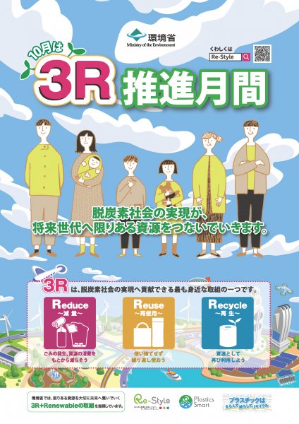 経済産業省を含む3R(リデュース・リユース・リサイクル)関係8省庁(※1,2)では、3R推進に対する理解と協力を求めるため、毎年10月を「リデュース・リユース・リサイクル推進月間(略称:3R推進月間)」と定め、広く普及啓発活動を実施しています。