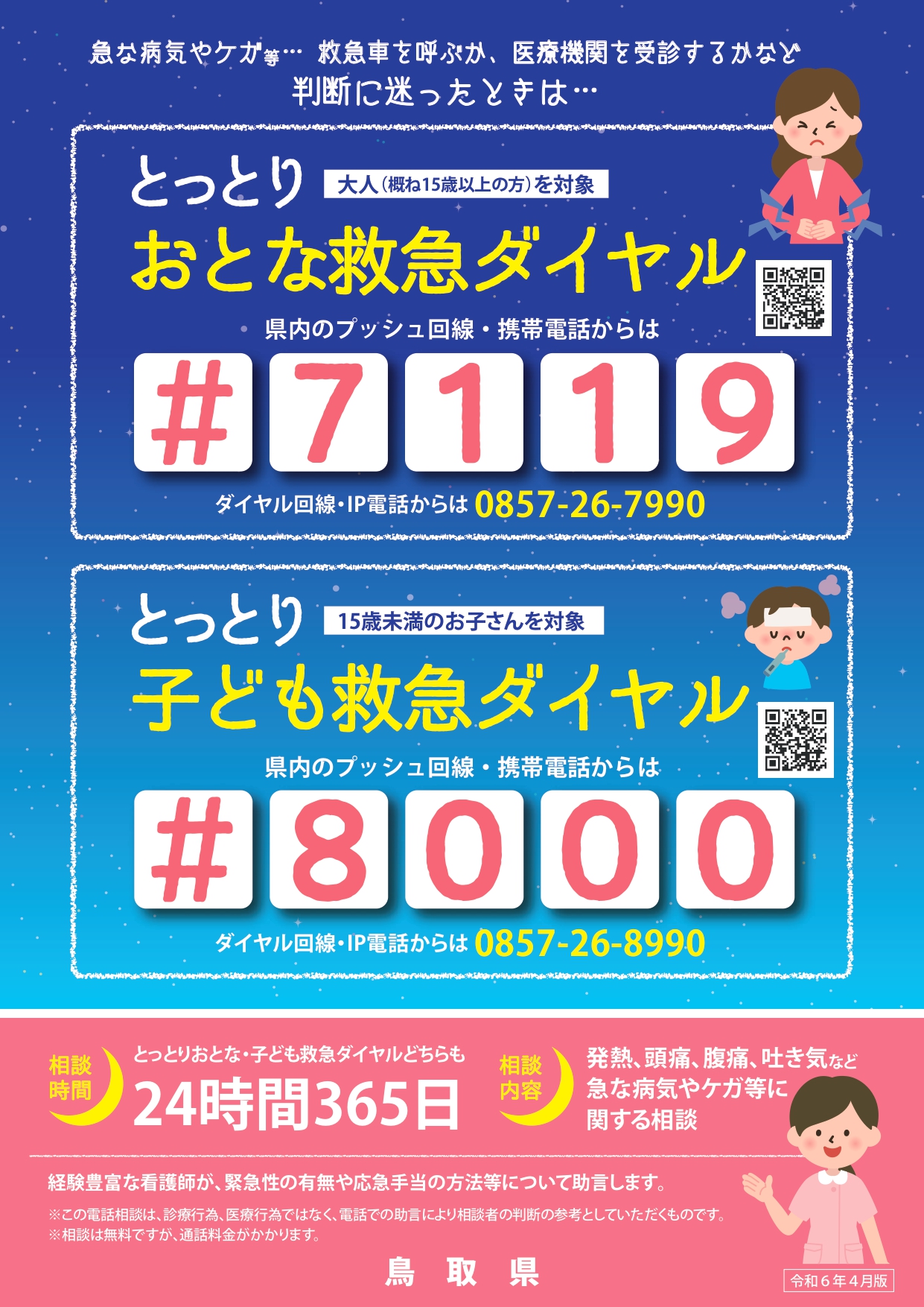 15歳未満のお子さんの急な病気やケガの場合は【とっとり子ども救急ダイヤル #8000】をご活用ください。